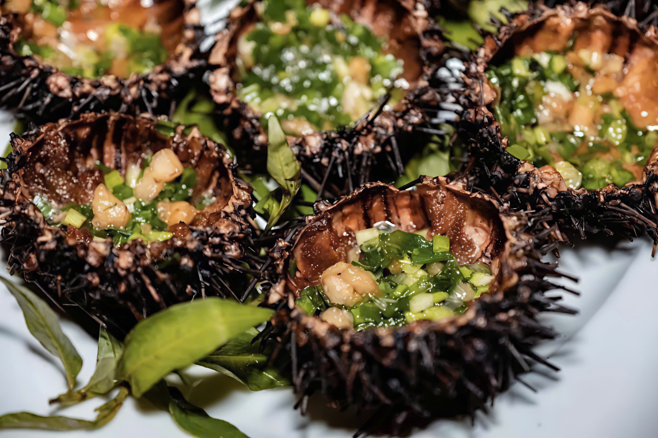 - Vị béo ngậy của nhum hòa quyện với mùi thơm của hành mỡ, ăn kèm muối tiêu chanh là “chuẩn bài”.